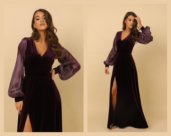 Plum Bridesmaid Velvet Dress High Quality Fabric Dress Luxury Gown Wrap V Neckline Dress Organza Bishop Sleeves Etsy
